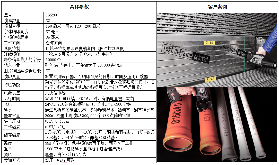 EBS260手持大字符噴碼機(jī)EBS 260 憑借其專利噴印技術(shù)取代了陳舊的手工標(biāo)識(如模具機(jī)、印花機(jī)、噴刷漆等,請工人操作時(shí)費(fèi)工時(shí)又效率低)