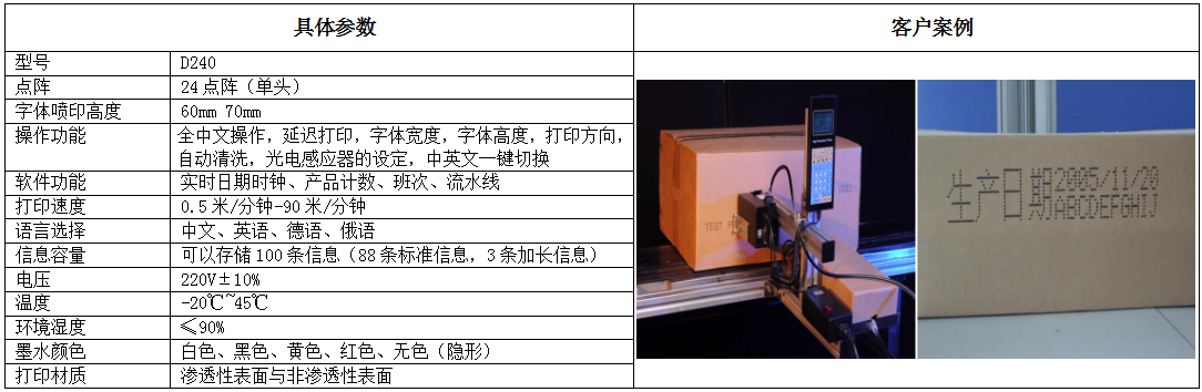 D240大字符噴碼機(jī)系統(tǒng) 廣泛應(yīng)用于食品飲料、化工建材、醫(yī)藥、鋼鐵、系統(tǒng)集成、產(chǎn)品定制、配線生產(chǎn)等行業(yè)。外觀簡潔大方,加入了提手設(shè)計(jì),更方便移動(dòng)。密封式寶石噴頭堅(jiān)固耐用,多種字型、字寬字高均可設(shè)置,并有延遲打印,自動(dòng)清洗等功能。主要用于石膏板、紙卷、編織袋等初級包裝上噴碼,也可用于外包裝上噴印零售所需的產(chǎn)品圖片、條碼、商標(biāo)和貨運(yùn)信息。